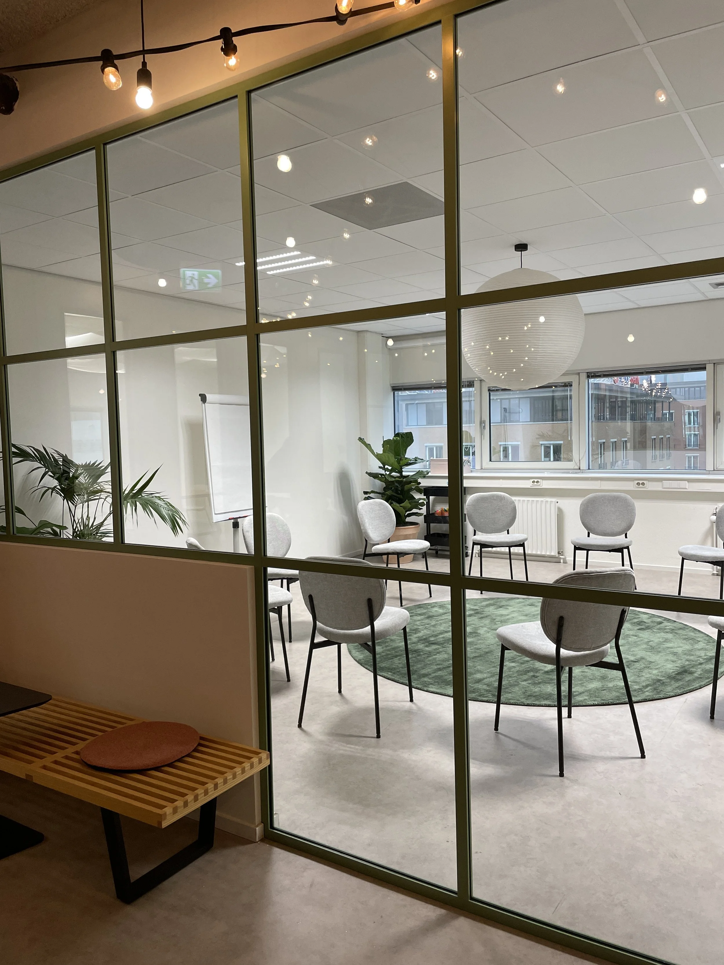 In het kantoor is het een ruimte voor trainingen, en kan ook omgebouwd worden naar werkplekken en door de schuifwand te openen kan de ruimte zelfs toegevoegd worden aan de zithoek wanneer er grotere events zijn.