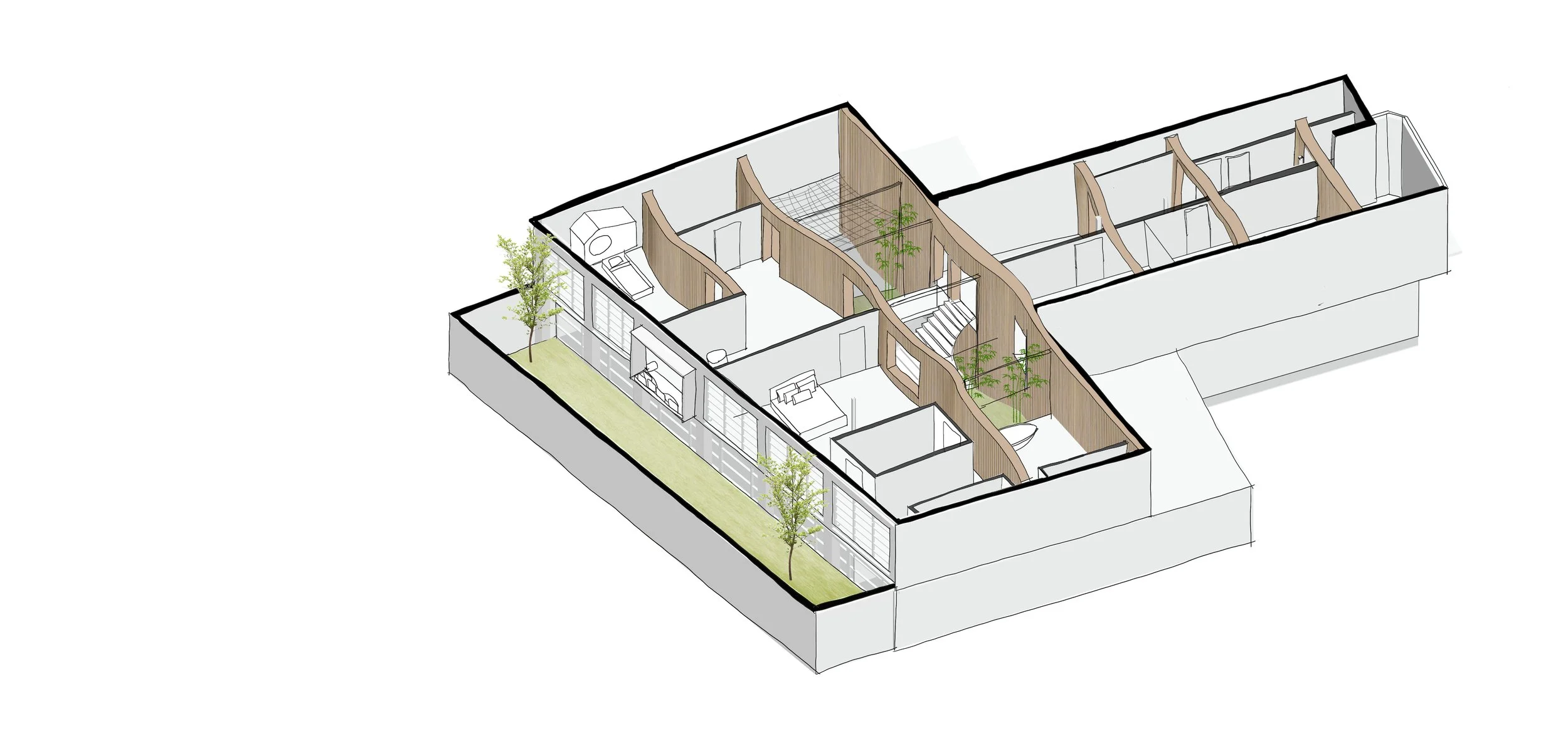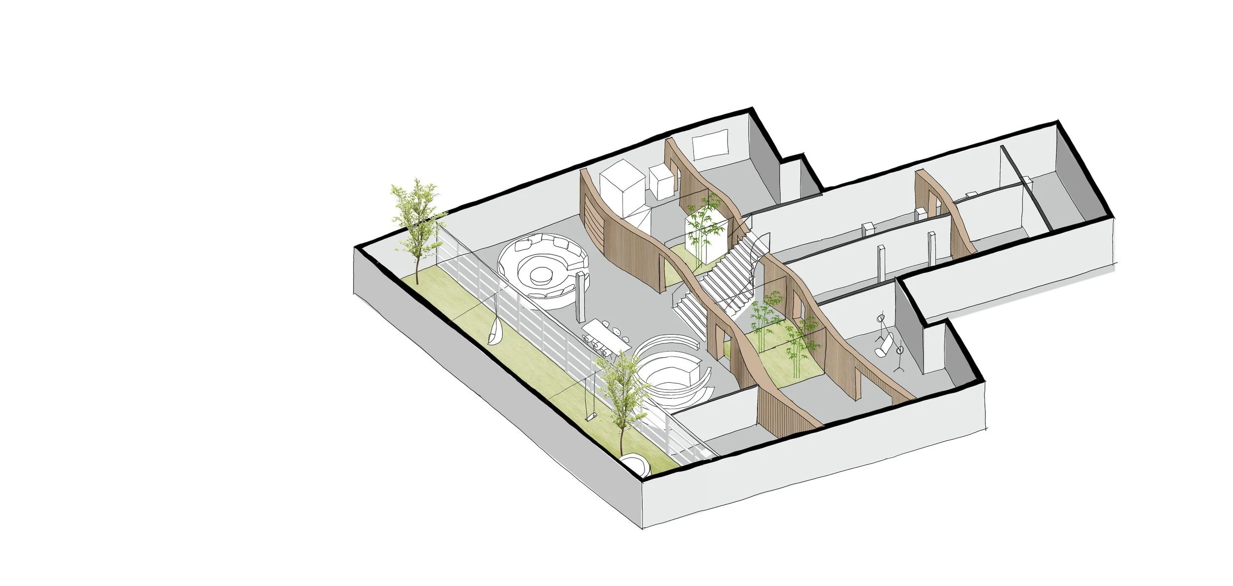 Om het souterrain te laten ademen, wordt de tuin verdiept en een royale patio toegevoegd. Zo stroomt daglicht diep naar binnen. De ruwe betonnen structuur krijgt een zachte tegenhanger in golvende houten wanden, die elke ruimte een eigen karakter geven.